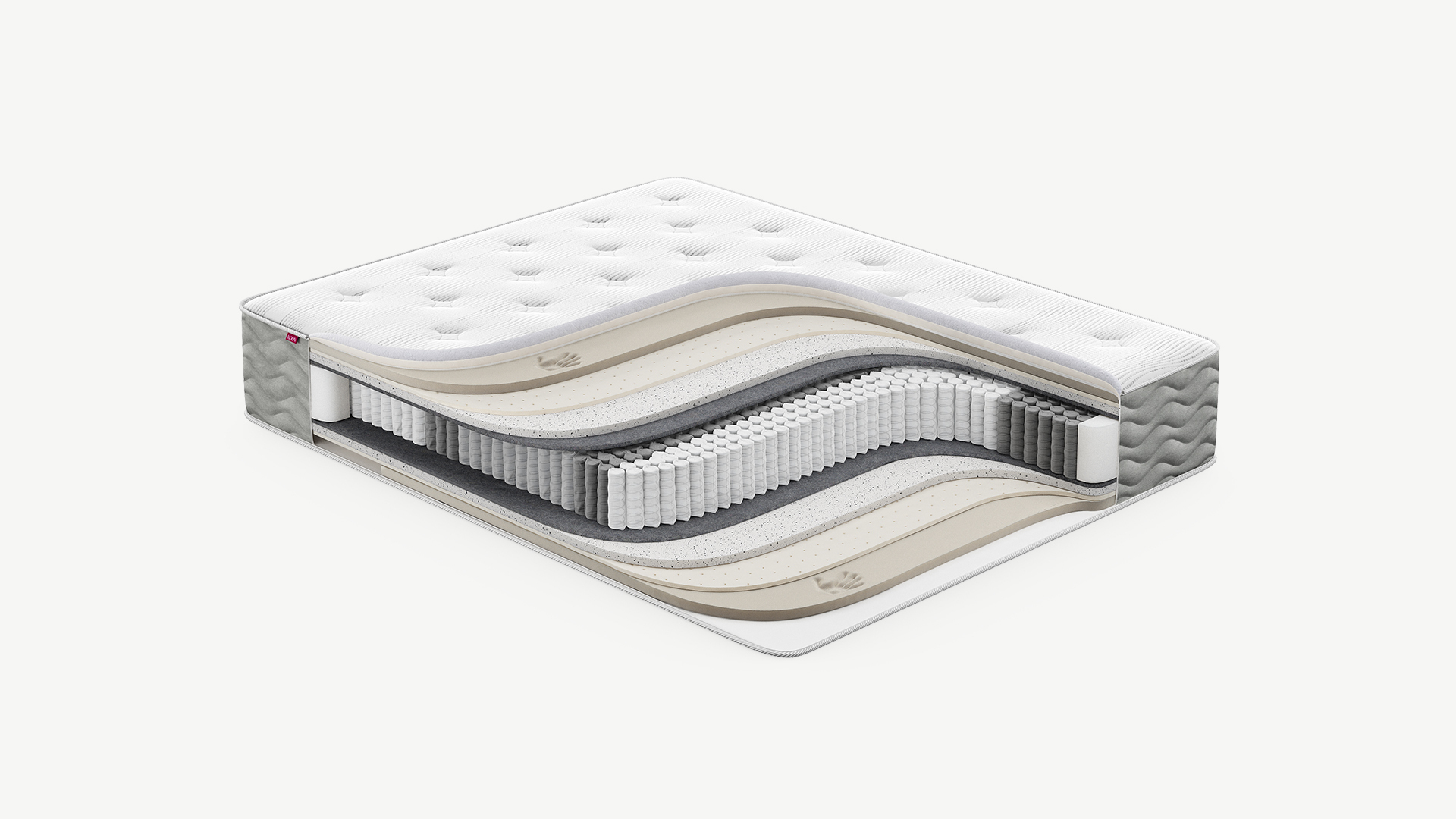 Повышает жесткость и плотность спального места, а также обеспечивает оптимальный воздухообмен благодаря объемной структуре материала. Улучшает эксплуатационные показатели матраса, не давая пружинному блоку механически воздействовать на комфортные слои.