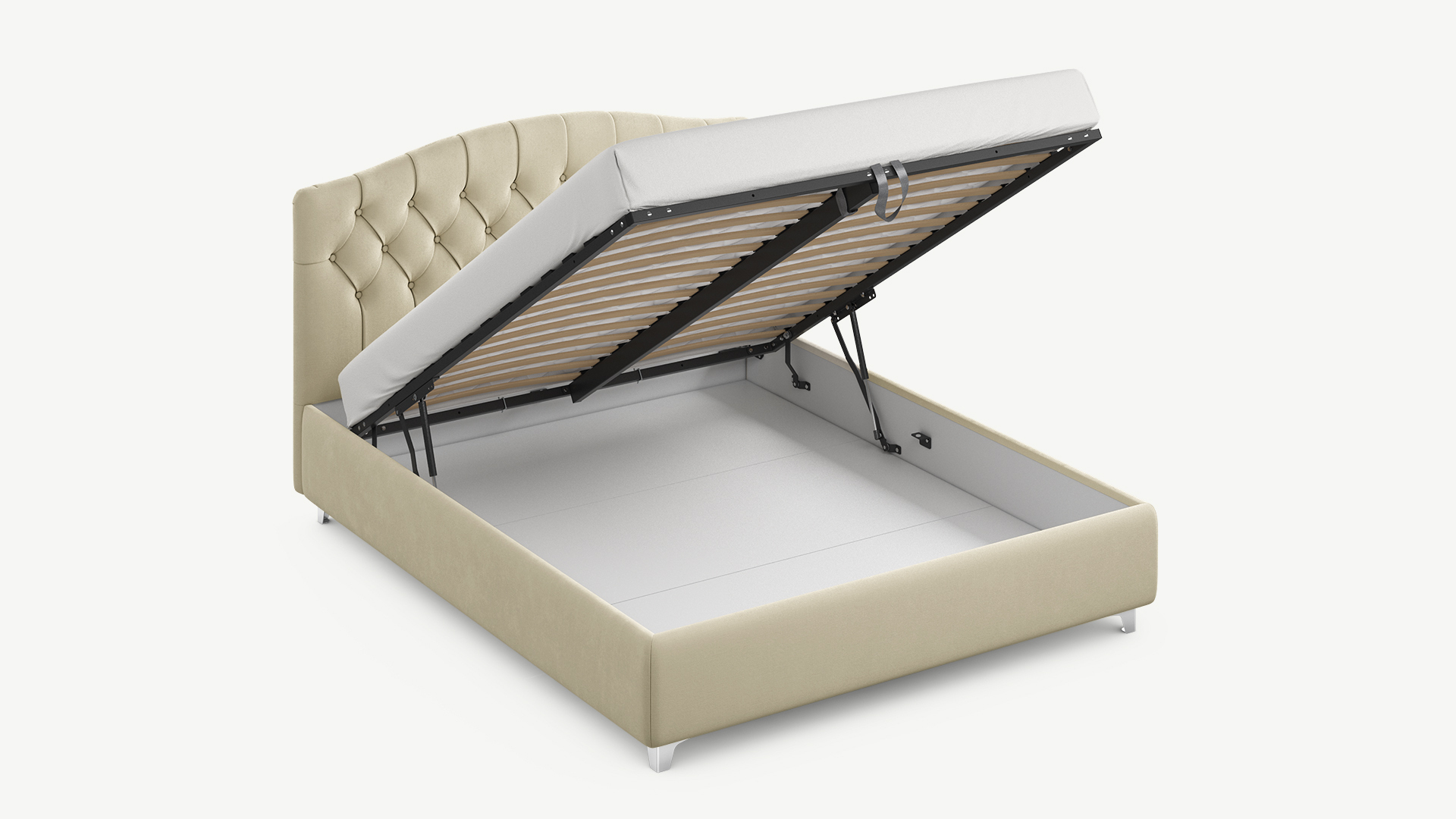 • Скрытая под основанием вместительная емкость без внутренних перегородок позволяет использовать всю площадь подкроватного пространства для хранения вещей.