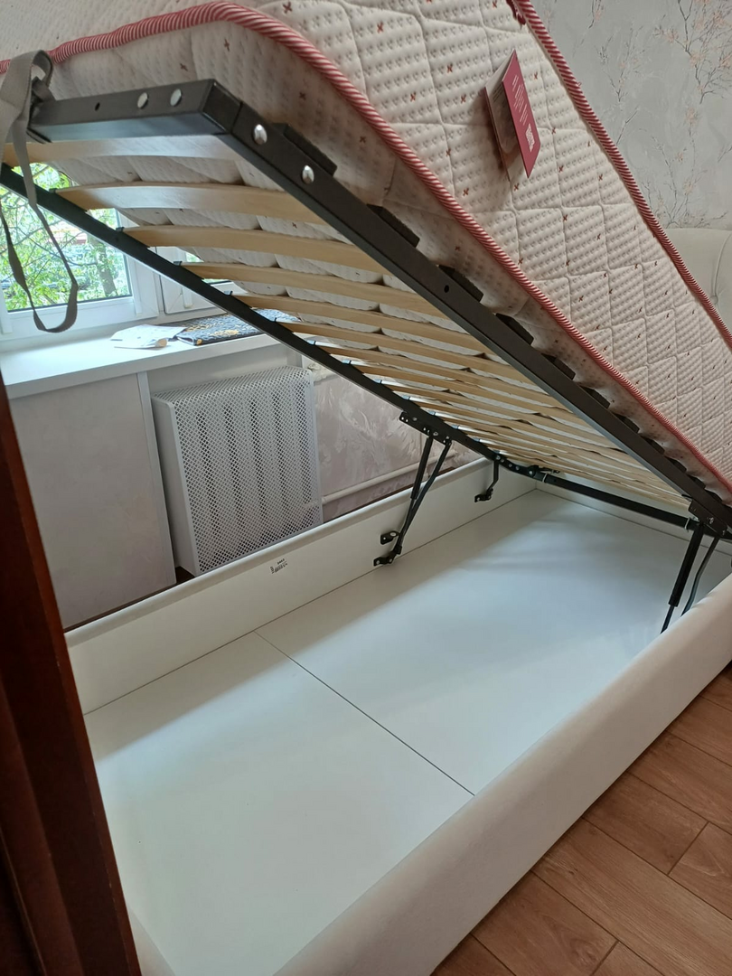 Газовый амортизатор подъёмного механизма. Позволяет без лишних усилий плавно и бесшумно поднять спальное место кровати и получить доступ к емкости для хранения.