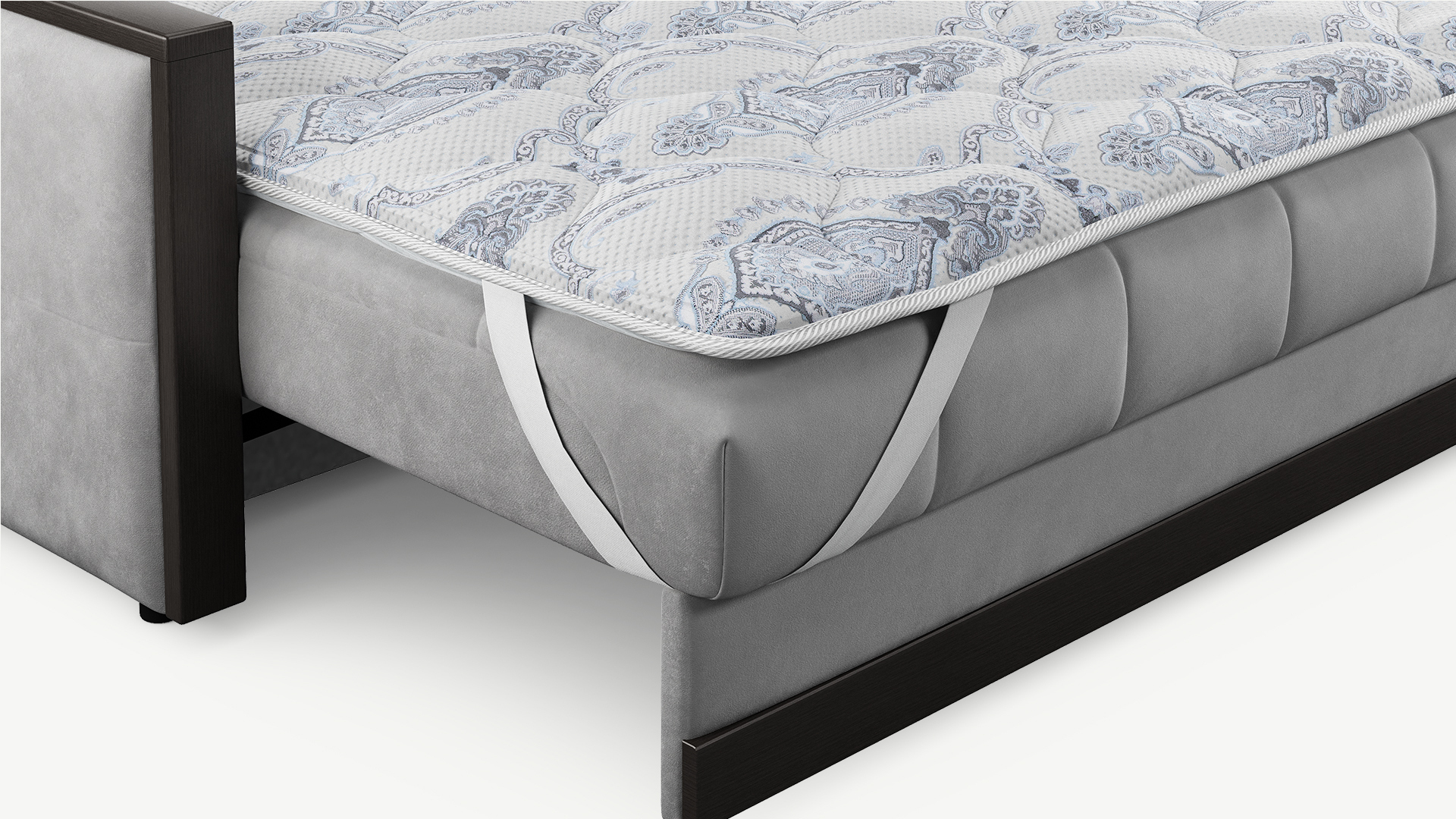 Топпер можно использовать как на диване, так и на матрасе. Фиксация на поверхности спального места осуществляется с помощью широких резинок в четырех угловых точках.