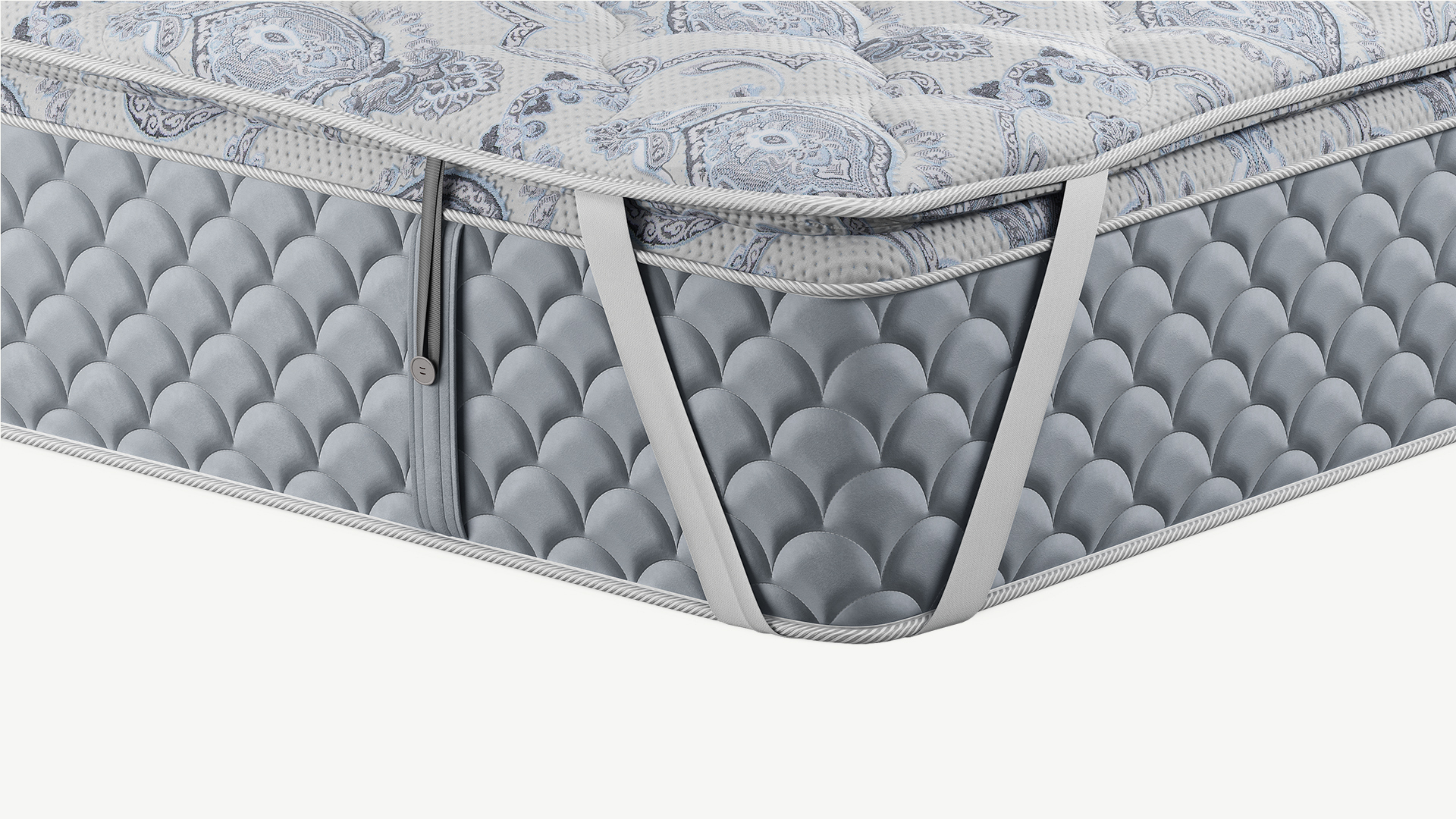 Дополнительно на топпере предусмотрены эластичные петли — для матрасов MOON в комплектациях Comfort и Prestige, оснащенных системой крепления на пуговицы по бокам.