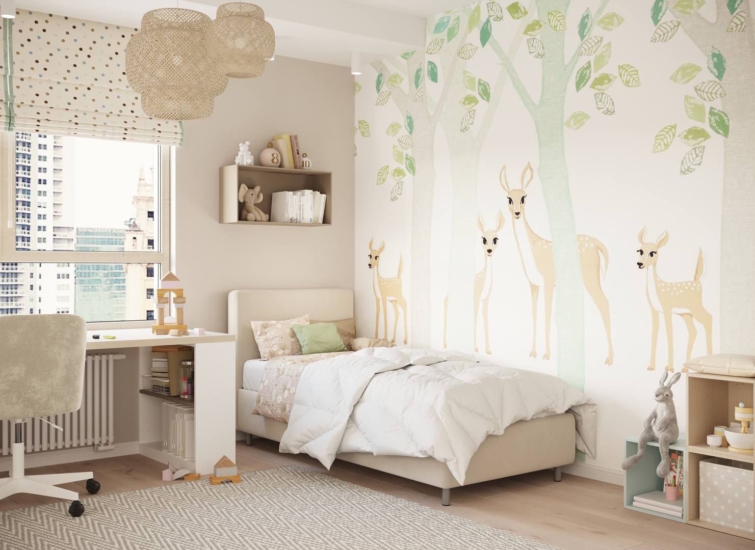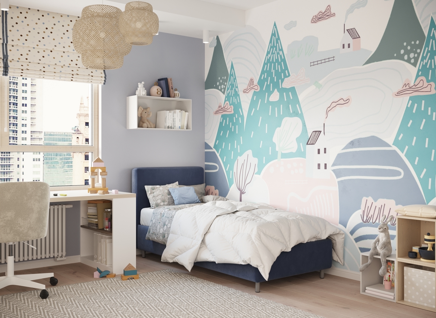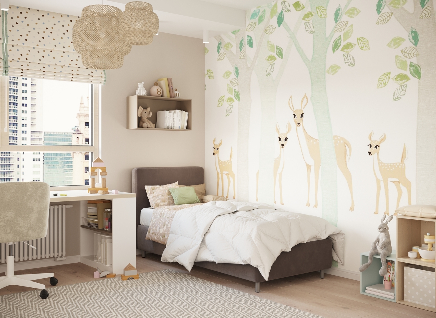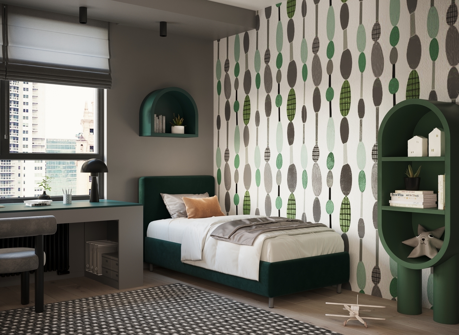 Обратная сторона изголовья выполнена в мебельной ткани и позволяет ставить кровать в центре комнаты для зонирования пространства.