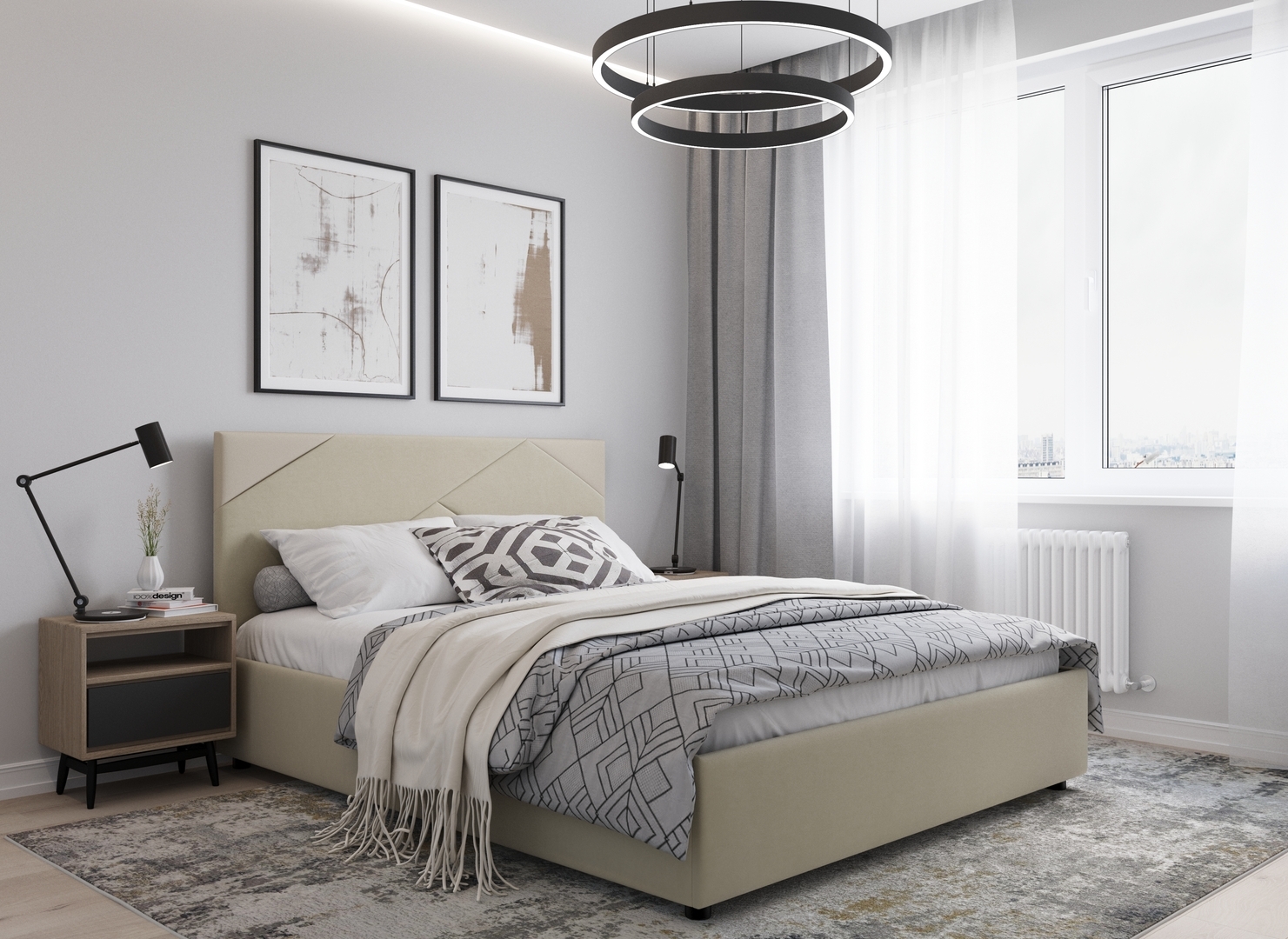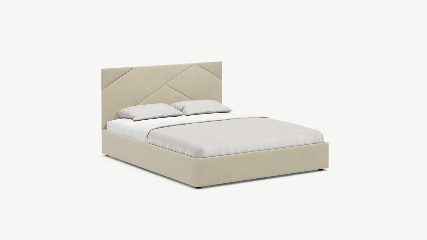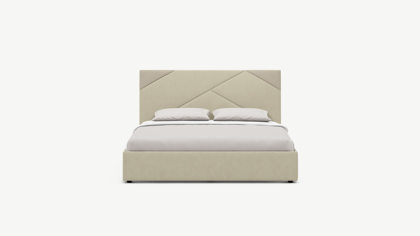 MOON FAMILY 1257 привлекает внимание оригинальным исполнением: широкие полосы ткани эффектно пересекают периметр изголовья, создавая на нем графический орнамент. Элегантным и практичным акцентом служат скрытые карманы, расположенные по его углам. Лаконичные формы объемных царг создают единый гармоничный образ и фокусируют внимание на центральном текстурном элементе кровати.