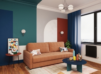 Синка, выполненная в обивочной ткани, позволяет ставить диван в центре комнаты и зонировать пространство.