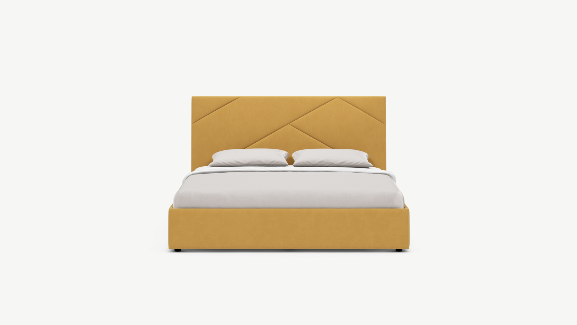 MOON FAMILY 1257 привлекает внимание оригинальным исполнением: широкие полосы ткани эффектно пересекают периметр изголовья, создавая на нем графический орнамент. Элегантным и практичным акцентом служат скрытые карманы, расположенные по его углам. Лаконичные формы объемных царг создают единый гармоничный образ и фокусируют внимание на центральном текстурном элементе кровати.