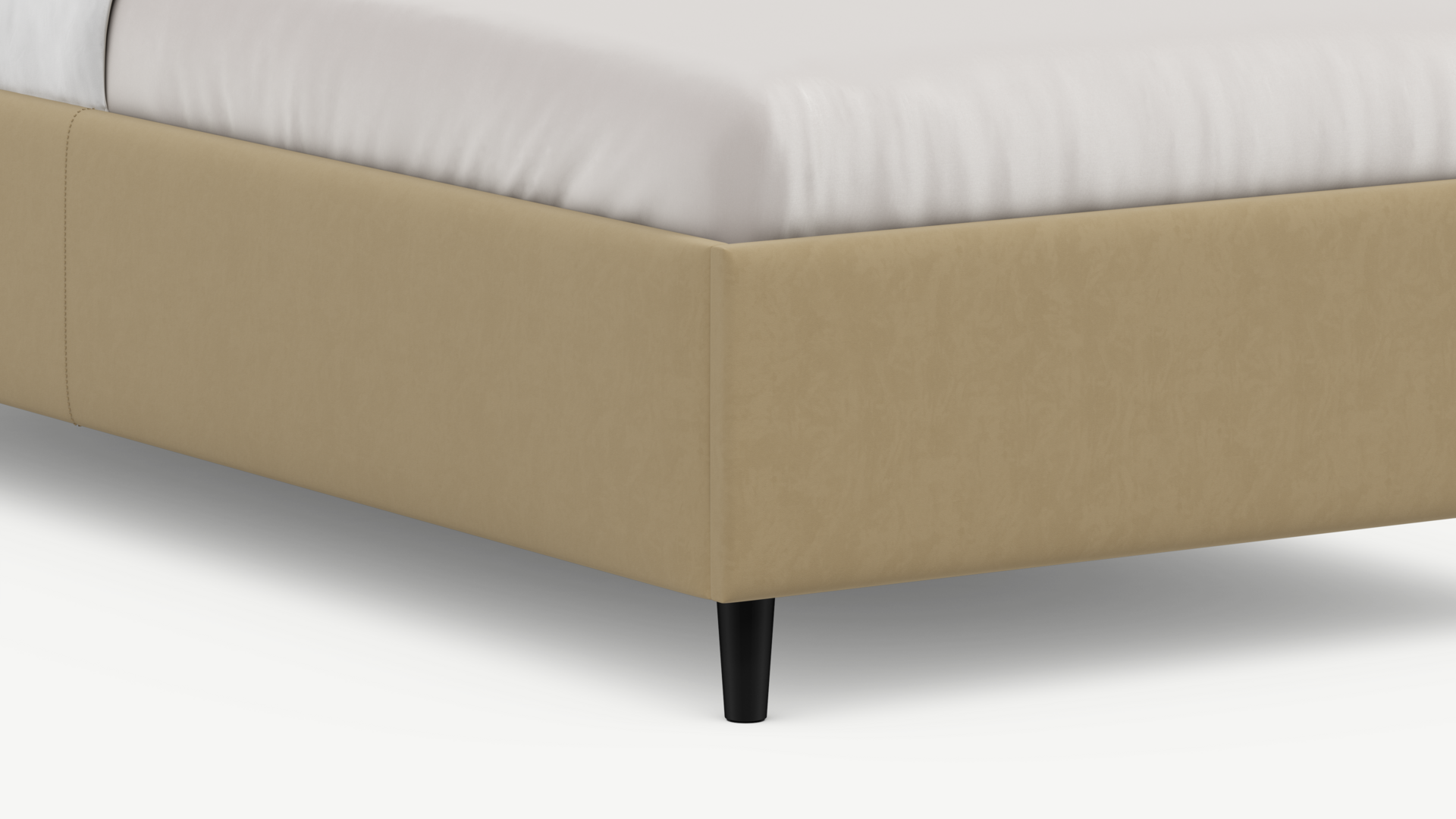 Царга, задающая пропорции, благодаря гладкости своей фактуры подчеркивает центральный элемент декора. Высокие опоры приподнимают фигуру кровати над полом и добавляют её образу визуальной легкости.