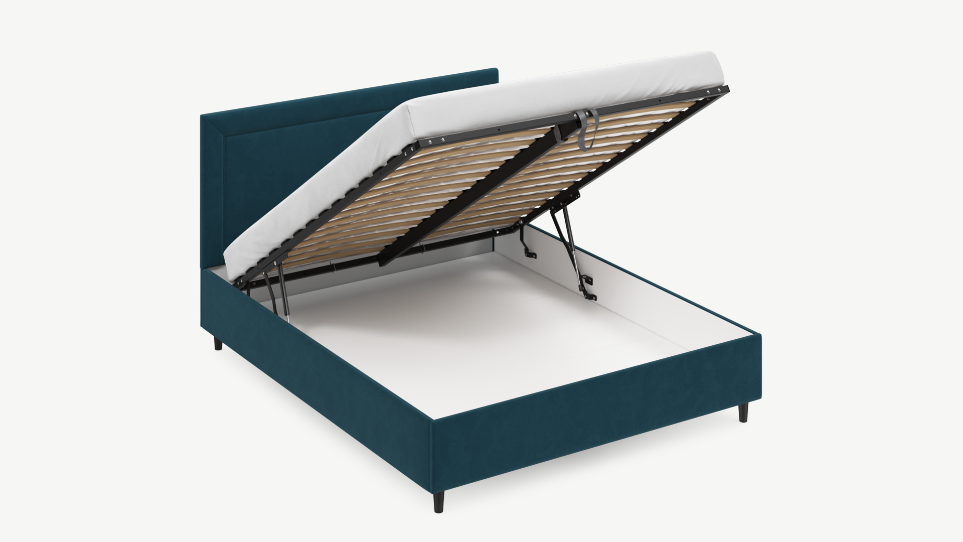 Вместительная емкость под кроватью без внутренних перегородок позволяет использовать для хранения вещей 100% пространства.